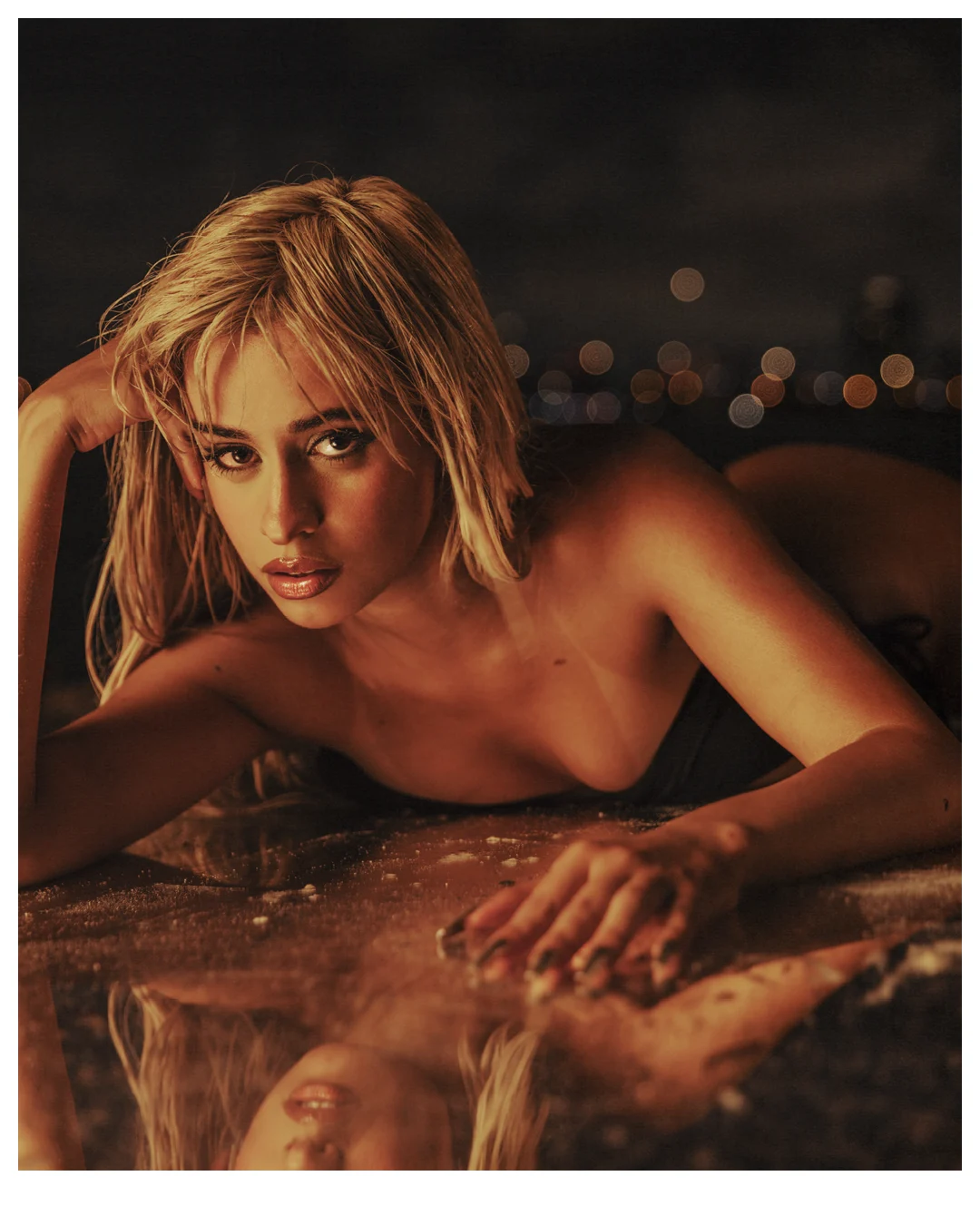 It’s exactly three weeks ahead of her fourth solo album release when we meet at Key Biscayne Dog Beach for the cover shoot, and it would initially appear that Cabello is light as ever, sporting a platinum blonde do and a sheer azurite Jean Paul Gaultier by Shayne Oliver dress with a metallic bathing suit underneath. It’s a humid 85 degrees, but the Miami native is unfazed as she climbs a bright yellow Mazda M5 draped in billowing black fabric to strike her first pose of the day.